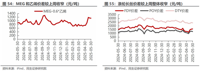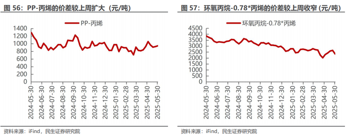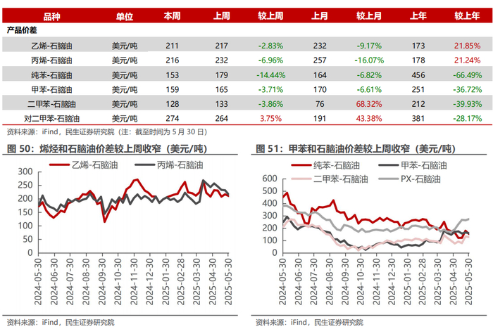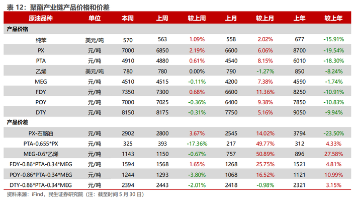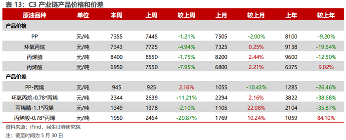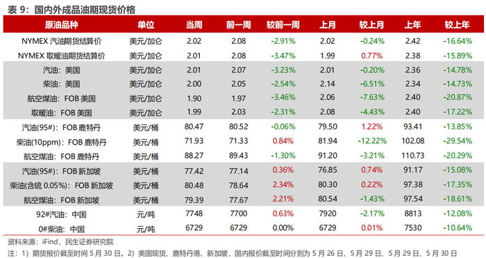 汽油价差收窄,烯烃价差收窄。截至5月30日,1)炼油板块,NYMEX汽油和取暖油期货结算价为2.02/2.01美元/加仑,周环比变化-2.91%/-3.47%,和WTI期货结算价差分别为23.84/23.44美元/桶,周环比变化-7.01%/-8.89%。2)化工板块,乙烯/丙烯/甲苯和石脑油价差为211/216/159美元/吨,较上周变化-2.83%/-6.96%/-3.71%;FDY/POY/DTY价差为1594/1244/2394元/吨,较上周变化+1.65%/-3.80%/-2.01%。
