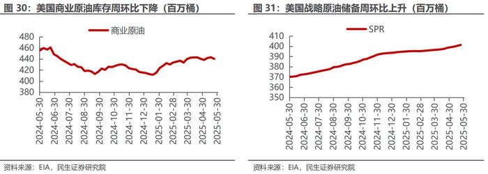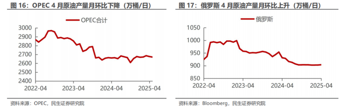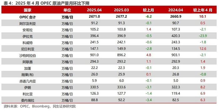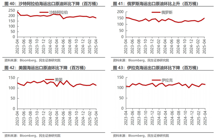 据Bloomberg 5月30日的统计数据,2025年4月海运出口:沙特179百万桶,同比下降14.7%,环比下降6.0%;俄罗斯149百万桶,同比上升15.6%,环比上升14.0%;美国113百万桶,同比上升4.8%,环比下降6.5%;伊拉克116百万桶,同比上升8.3%,环比下降2.2%。