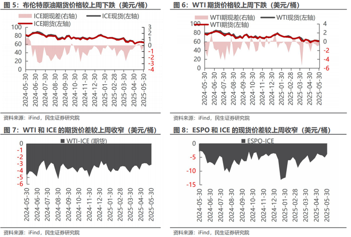 原油期货:据iFind数据,截至2025年5月30日,布伦特原油期货结算价为63.90美元/桶,较上周下跌1.36%;WTI期货结算价60.79美元/桶,较上周下跌1.20%。