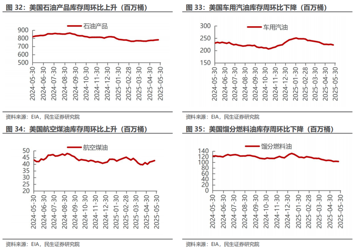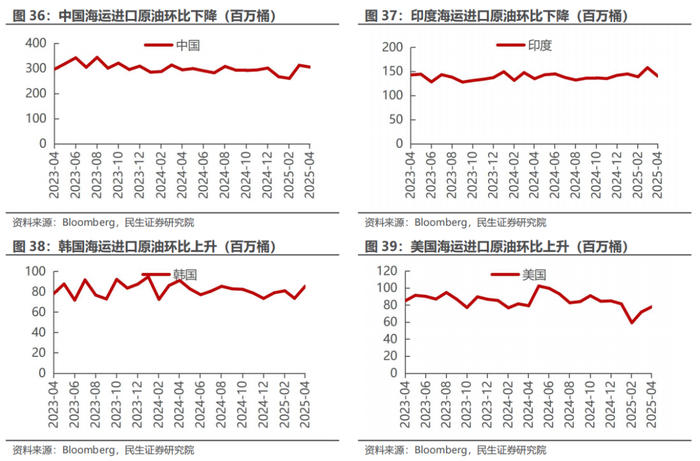 据Bloomberg 5月30日的统计数据,2025年4月海运进口:中国305百万桶,同比上升3.7%,环比下降2.3%;印度140百万桶,同比上升3.9%,环比下降11.3%;韩国85百万桶,同比下降6.3%,环比上升16.3%;美国78百万桶,同比下降1.5%,环比上升8.6%。