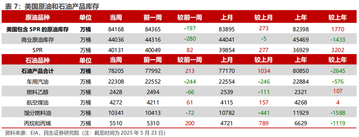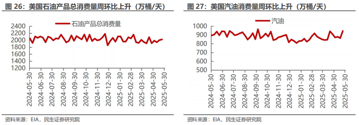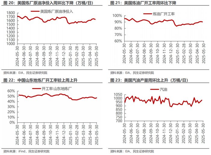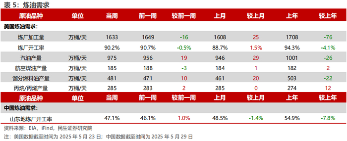 美国原油产量上升,炼油厂日加工量下降。截至5月23日,1)原油方面,美国原油产量1340万桶/日,周环比+1万桶/日。2)成品油方面,美国炼油厂日加工量为1633万桶/日,周环比-16万桶/日;炼厂开工率90.2%,周环比-0.5pct;汽油/航空煤油/馏分燃料油产量分别为975/185/481万桶/日,周环比+19/-3/+10万桶/日。