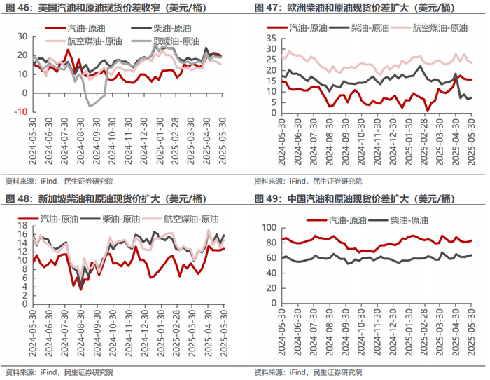 据iFind数据,截至2025年5月30日,国内汽柴油现货价格为7748、6729元/吨,周环比变化+0.63%、+0%;和布伦特原油现货价差为83.01、63.69美元/桶,周环比变化+2.07%、+1.24%。