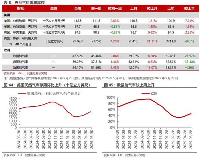 欧盟储气率上升。截至5月29日,欧盟储气率47.50%,较上周+2.04pct。