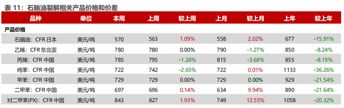 炼化产品价格和价差表现