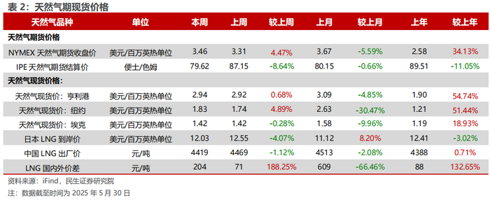 截至2025年5月30日,NYMEX天然气期货收盘价为3.46美元/百万英热单位,较上周上涨4.47%;东北亚LNG到岸价格为12.03美元/百万英热,较上周下跌4.07%;中国LNG出厂价为4419元/吨,较上周下跌1.12%。