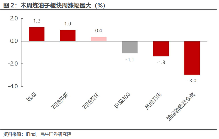 截至5月30日,本周沪深300下跌1.1%,中信石油石化板块上涨0.4%。各子板块中,炼油子板块周涨幅最大,为1.2%;油品销售及仓储周跌幅最大,为-3.0%。