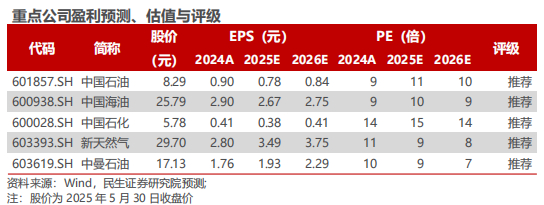 投资建议:推荐以下两条主线:1)油价有底,石油企业业绩确定性高,叠加高分红特点,估值有望提升,建议关注抗风险能力强且资源量优势强的中国石油、产量持续增长且桶油成本低的中国海油、高分红一体化公司中国石化;2)国内鼓励油气增储上产,建议关注产量处于成长期的新天然气、中曼石油。