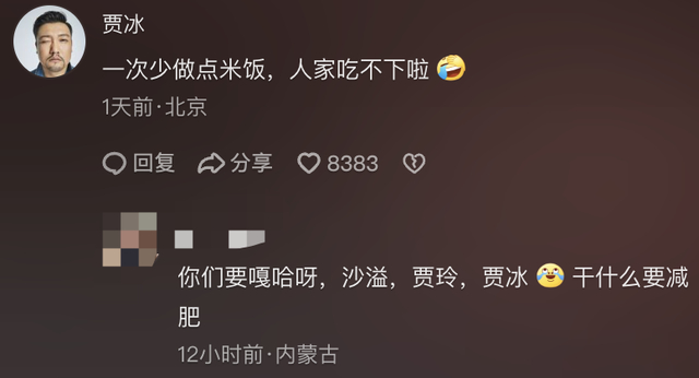 贾冰本人更是在评论区笑称:一次少做点米饭,人家吃不下啦。网友:冰哥做饭那么好吃,怎么忍得住!