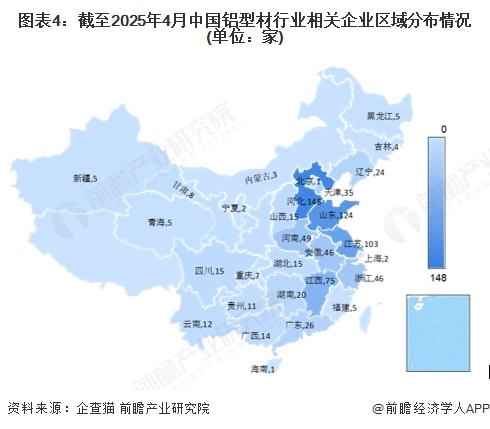 在企查猫上查找范围为“企业名、经营范围、企业简介和品牌/产品”中包括“铝型材”的企业,登记状态为“存续/在业”,行业为“制造业:C3252铝压延加工”。我国铝型材行业主要集中在河北、山东和江苏地区,其中河北省注册企业数量148家,山东省注册企业数量124家,江苏省注册企业数量103家。