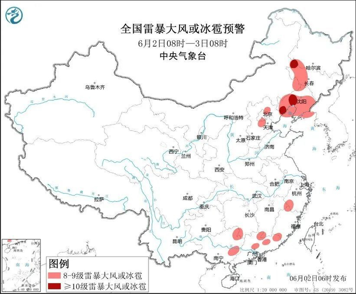 中央气象台6月2日6时继续发布强对流天气蓝色预警:预计6月2日8时至3日8时,东北地区中西部、华北东北部、江南东北部、华南中北部等地的部分地区将有8级以上雷暴大风或冰雹天气,其中,黑龙江西南部、吉林西北部、辽宁中西部等地的部分地区将有10级以上雷暴大风,最大风力可达11级以上,辽宁中西部等地局地不排除出现龙卷的可能性;东北地区中北部、江南中东部、华南中东部、西北地区南部、西南地区北部和南部等地的部分地区将有小时雨量大于20毫米的短时强降水天气,其中,福建东部和南部、云南东南部、广东中南部等地的部分地区小时雨量大于50毫米。