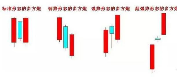 两阳夹一阴既是上涨中继信号,也是底部反转信号,技术特征主要有3点:1)它是由三根K线组合而成;2)第一天收出一个大阳线或中阳线,第二天下行收出一根实体与第一天差不多的阴线,第三天收出一根大阳线或中阳线,实现技术反包;3)两阳夹一阴存在技术变形,强势程度也不相同,如下图所示。