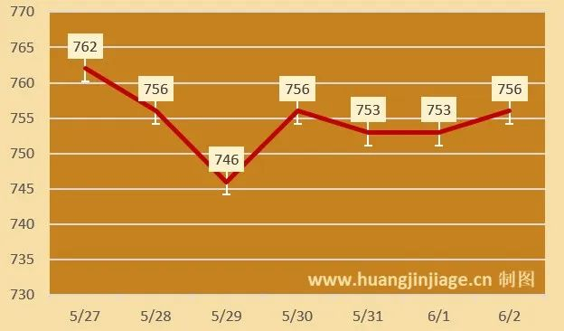 今日黄金回收价格每克756元,铂金回收价格每克218元,钯金回收价格每克190元,18K金回收价格每克544元,白银回收价格每克5.7元。(黄金行情是波动的,以结算价格为准。)