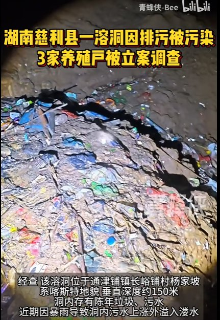 "该溶洞位于通津铺镇长峪铺村杨家坡,系喀斯特地貌,垂直深度约150米,洞内存有陈年垃圾、污水,近期因暴雨导致洞内污水上涨外溢入溇水。因溶洞内部结构复杂,已邀请中国环科院与省水环所专家现场勘查、指导处置,目前正在全力开展垃圾清运、污水清理工作。市生态环境局慈利分局已对长峪铺村涉嫌违法排污的黎某等3家养殖户立案调查,对溇水流域水质进行加密监测。目前,监测结果显示慈利县溇水饮用水源地水质稳定达到地表水II类标准。”