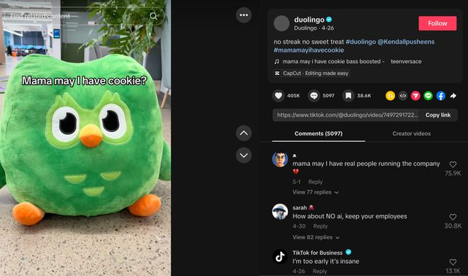 邮件公开后48小时内,Duolingo的社交媒体评论区彻底沦陷。在TikTok上,一个播放猫头鹰玩偶问“Mama, may I have a cookie”的趣味视频下,最高赞评论变成了“Mama, may I have real people running the company”,获得了超过75000个赞。
