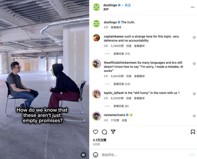 正是在这样的背景下,5月17日,Duolingo做出了那个看似“聪明”的决定——清空所有社交媒体内容。官方说法是“探索沉默的力量”,但时机如此巧合,明眼人都看得出这是转移焦点的策略。