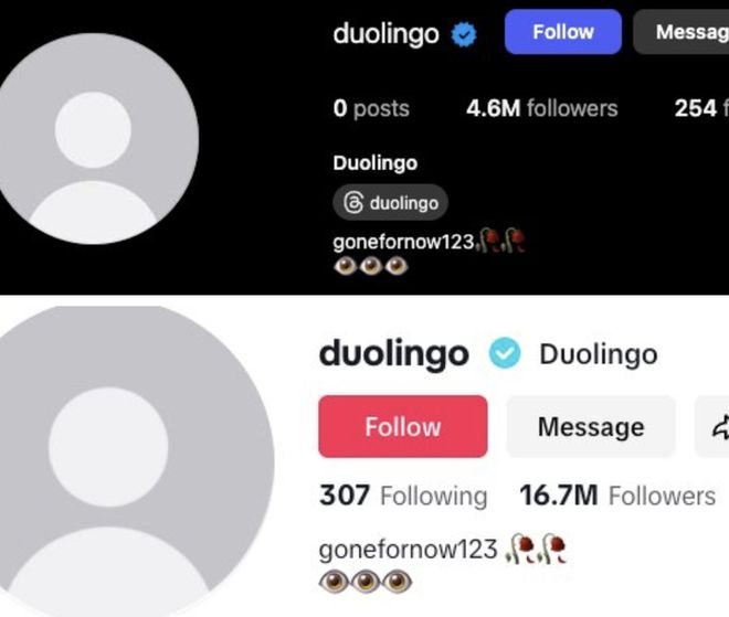 2025年5月17日,当Duolingo突然清空其TikTok和Instagram上的所有内容时,1000多万粉丝面对的是一片虚无。账号简介只剩下神秘的"gonefornow123",配着枯萎的玫瑰。