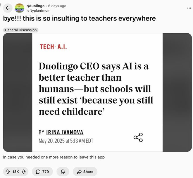三周前,CEO Luis von Ahn刚刚宣布公司将转向"AI-first"战略,计划用人工智能逐步取代承包商。消息一出,社交媒体炸开了锅。"Mama, may I have real people running the company?"这条评论获得了69,000个赞。用户们开始删除app、取消订阅,有人甚至录制视频,亲手终结了1500多天的连续学习记录。