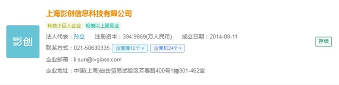 上海影创信息科技有限公司(简称:影创科技)成立于2014年8月,法人代表是孙立,注册资金为394.9869(万人民币),是一家专注于混合现实(MR)、增强现实(AR)和虚拟现实(VR)智能眼镜整体软硬件研发的高科技企业。公司总部位于上海,在青岛、北京、重庆、成都、南昌、南京等多地设有产业基地,研发及生产场所占地面积超过2万平方米。