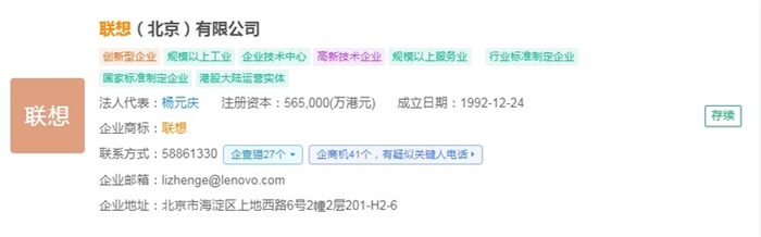 企查猫资料显示,联想(北京)有限公司成立于1992年12月,法人代表是杨元庆,注册资金为565,000(万港元),是一家全球知名的多元化技术公司。业务涵盖个人电脑、智能手机、服务器、存储设备、智能物联网设备等多个领域。