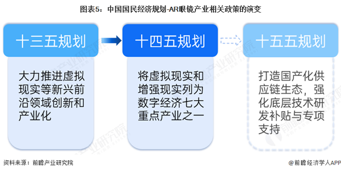 AR眼镜作为增强现实技术的核心载体,在我国战略新兴产业体系中占据着重要地位。从我国国民经济“十三五”规划到“十四五”规划,国家对AR眼镜行业的支持政策呈现出逐步深化和细化的趋势。“十三五”规划中提出“大力推进虚拟现实等新兴前沿领域创新和产业化”,到了“十四五”规划,“虚拟现实和增强现实(VR/AR)”被明确列为数字经济七大重点产业之一,标志着该行业正式进入国家战略的核心层面。