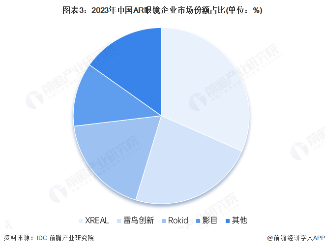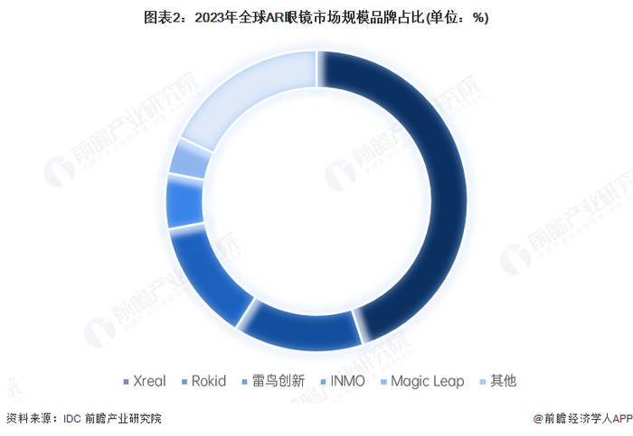 在国内,雷鸟创新、Xreal、Rokid、INMO并称为“AR四小龙”,合计占整体市场份额(以出货量计算)超80%。据IDC数据显示,2023年,按AR眼镜出货量计算的中国AR厂商份额前四名,分别为XREAL(31.6%)、雷鸟创新(23.1%)、Rokid(18.4%)和影目(11.7%)。