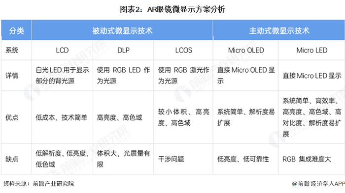 其中微显示方案可分为被动式微显示技术和主动式微显示技术。当前AR眼镜主流方案有DLP、LCOS、Micro OLED和Micro LED,其中Micro OLED和Micro LED被认为是未来AR眼镜微显示方案的主流趋势。