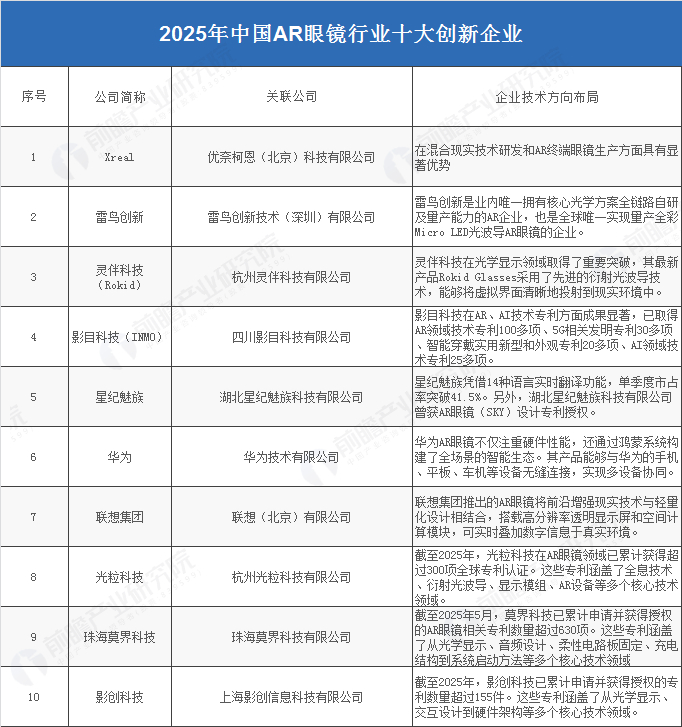2025年中国AR眼镜产业十大创新企业:Xreal、雷鸟创新、灵伴科技、光粒科技、星纪魅族……
