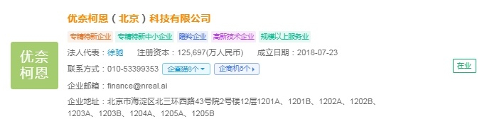 企查猫资料显示,优奈柯恩(北京)科技有限公司成立于2018年7月,法人代表是徐驰,注册资金为125,697(万人民币),是一家全球领先的消费级增强现实(AR)眼镜研发、设计和制造公司。