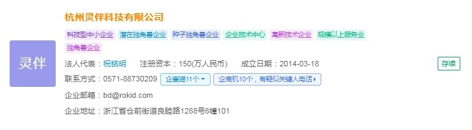 杭州灵伴科技有限公司(Rokid)成立于2014年3月,法人代表是祝铭明,是一家专注于人机交互技术的产品平台公司,深耕5G、AI和AR领域的软硬件产品开发。公司通过语音识别、自然语言处理、计算机视觉、光学显示、芯片平台、硬件设计等多领域研究,将前沿的AI和AR技术与行业应用相结合,为不同垂直领域的客户提供全栈式解决方案。
