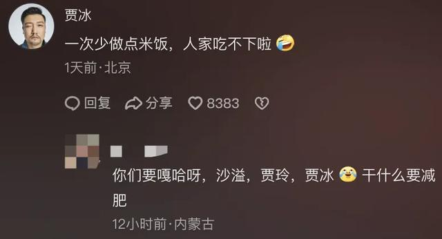 贾冰本人更是在评论区笑称:一次少做点米饭,人家吃不下啦。网友:冰哥做饭那么好吃,怎么忍得住!