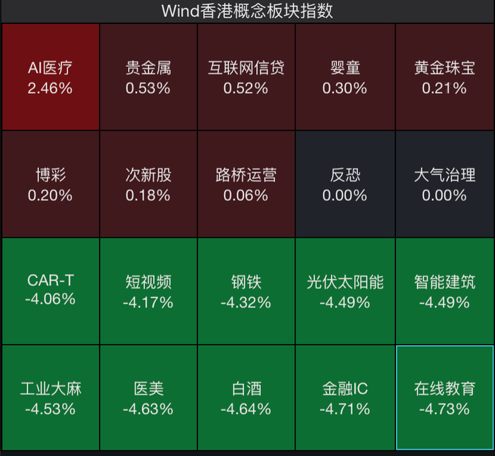 板块方面,在线教育、金融IC、白酒、医美等整体跌幅较大;AI医疗、贵金属、黄金珠宝等逆势走强。其中,潼关黄金(00340,HK)涨超12%。