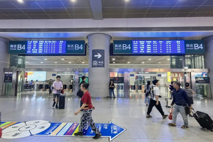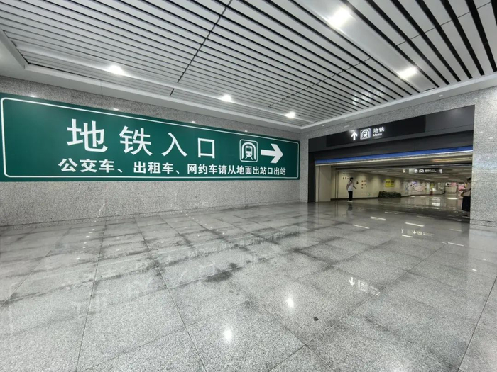乘客可根据“地铁入口”指引标识,抵达铁路与地铁的联络通道,从联络通道快速进入地铁区域乘车;