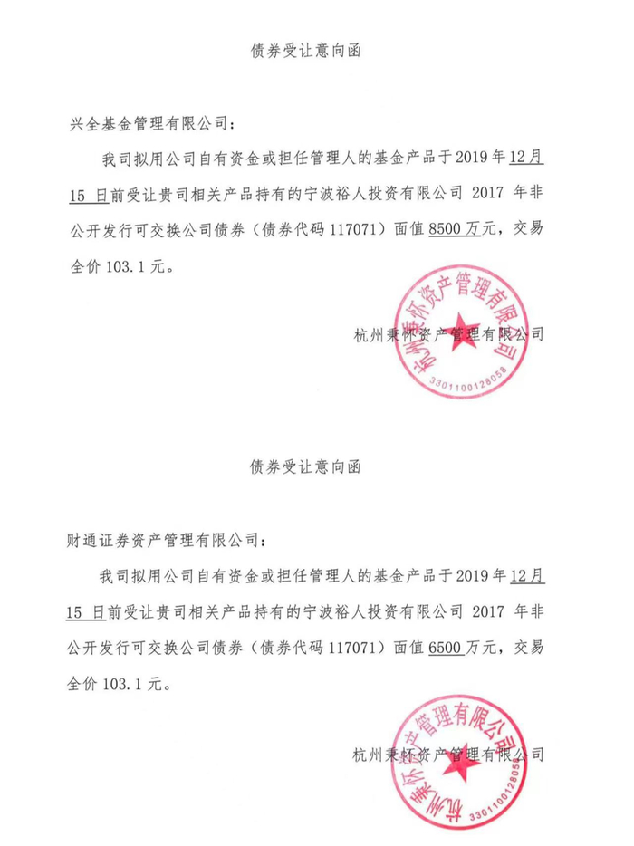 财联社记者获得的两份债券受让意向函显示,2019年12月15日,杭州秉怀分别从兴全基金和财通资管处受让面值8500万元、6500万元的“17裕人E1”债券。