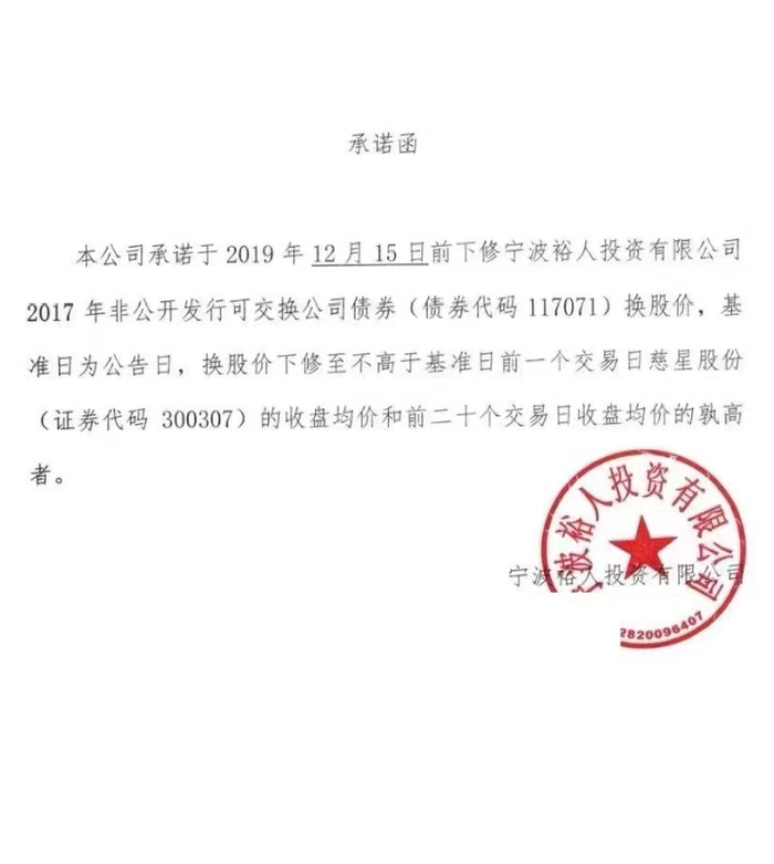 在这一过程中,还有一个隐藏的关键细节,宁波裕人出具了承诺函,承诺在2019年12月15日之前,换股价下修至不高于基准日前一个交易日慈星股份的收盘均价和前二十个交易日收盘均价的孰高者。