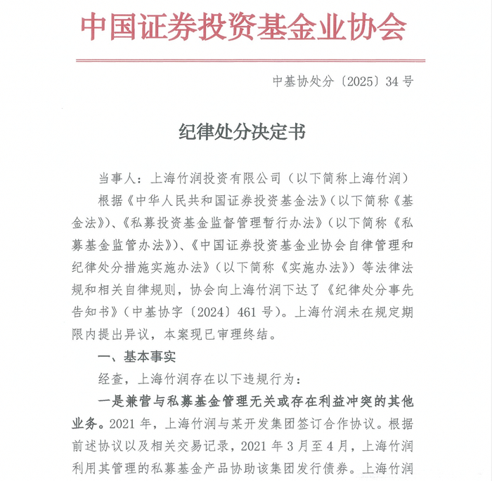 今年4月,上海竹润再次因两项违规被中国证券投资基金业协会(简称“中基协”)处分,协会认定2021年3月至4月,上海竹润利用私募基金产品协助某开发集团发行债券并收取投资咨询费;2021年8月至9月,上海竹润在管理私募基金产品过程中,按照某投资公司或其指定的相关主体指令购买指定债券。