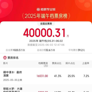 据猫眼专业版数据,截至6月2日12时47分,2025年端午档电影票房破4亿,大幅超去年同期,《碟中谍8:最终清算》领跑。