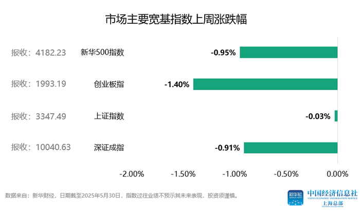 上周主要宽基指数集体收跌。其中,上证指数周度下跌0.03%,深证成指周度下跌0.91%,创业板指周度下跌1.4%,新华500指数周度下跌0.95%。