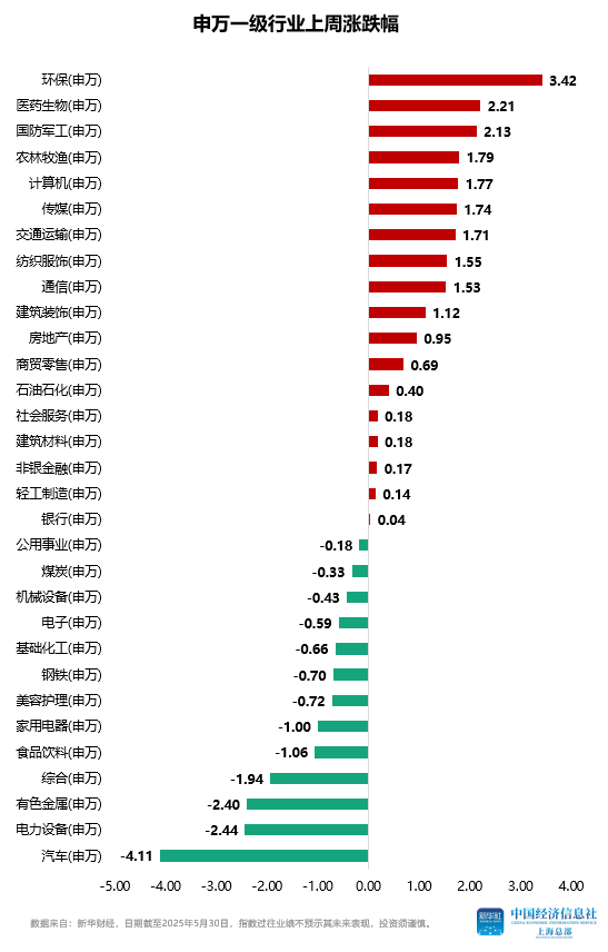 从申万一级行业来看,上周行业指数涨跌各半,环保、医药生物、国防军工、农林牧渔、计算机等行业指数涨幅居前,汽车、电力设备、有色金属、综合、食品饮料等行业指数跌幅靠前。