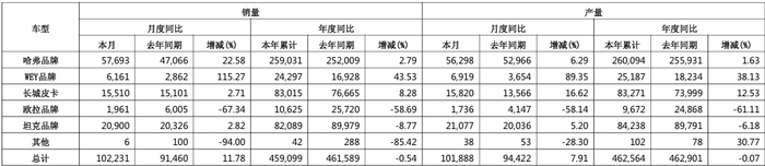 6月2日,长城汽车(601633/02333/82333)发布公告,披露了2025年5月的产销快报。根据公告数据,5月公司总销量为10万台,同比增长11.78%,而5月产量为10万台,同比增长7.91%。具体数据见下表: