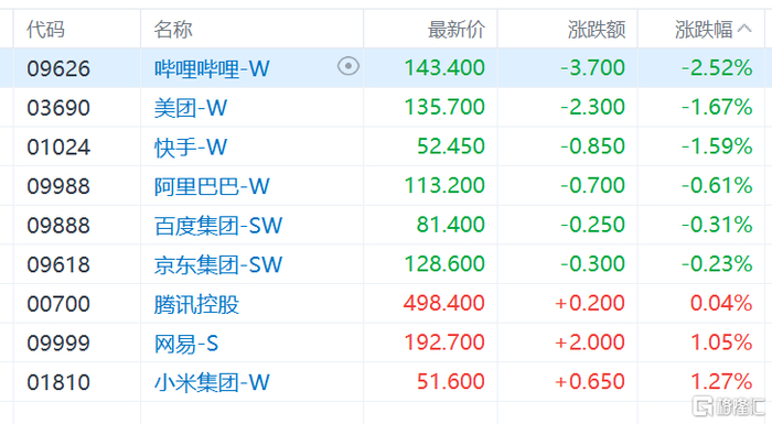权重科技股涨跌互现,美团、快手跌超1%,阿里巴巴、百度、京东微跌;网易、小米涨超1%,腾讯控股跟涨。