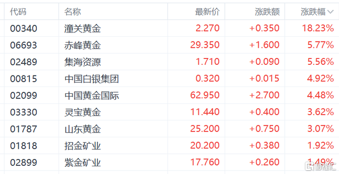 黄金股强势,潼关黄金大涨超18%,赤峰黄金、中国黄金国际、灵宝黄金、山东黄金、招金矿业、紫金矿业等跟涨。