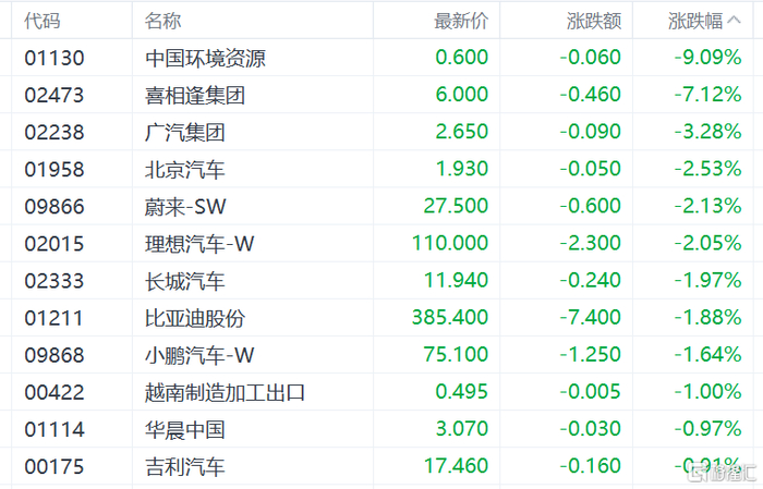 汽车股普跌,喜相逢集团跌超7%,广汽集团、北京汽车、蔚来、理想汽车、长城汽车、比亚迪股份等下跌。