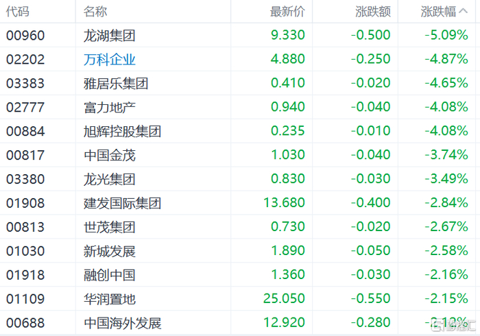 内房股跌幅居前,龙湖集团跌超5%,万科企业、富力地产、中国金茂、龙光集团、建发国际集团等跟跌。
