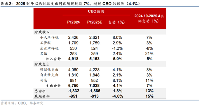 2025财年以来,美国财政赤字规模超预期。虽然政府效率部(DOGE)推动裁员和精简支出来降低政府支出,但是从已有的财政数据来看,2025财年以来美国财政赤字规模整体超预期。2025财年以来(2024年10月到2025年4月,下同),累计赤字规模为1.05万亿美元,超过2024财年同期水平,同比增速为13%(图表1),高于CBO在1月的预测(1.8%),背后的主要原因是强制性支出以及利息支出的高增长导致2025财年以来财政支出同比增速达到7%,超过CBO的预测(4.1%)(图表2)。