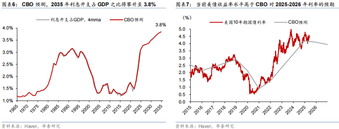 如果美债利率持续上升,不排除利息支出超出预期。截至2025年一季度的四个季度,美国累计利息支出规模达到9415亿美元,占2025年一季度GDP(年率)的3.1%,为1965年以来的最高水平,且预计未来将进一步上升(图表6)。如果美债利率持续上升或者维持高位,不排除利息支出将超预期。CBO的预测中假设2025-2026年的10年期美债收益率为4.1%和3.94%,而最新的美债收益率为4.4%(图表7),若美债利率持续位于高位或者进一步上升,利息支出将超过当前的估计。