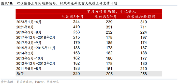 2025财年美债大量到期以及债务上限解除预计不会明显影响美债发行节奏,短期美债供给压力可控。一方面,2025财年美债到期规模虽然达到9.3万亿美元,但主要是对市场影响有限的短债,且与2024财年规模相当(图表8)。另一方面,债务上限并未影响财政部的发债计划,预计债务上限在6月或7月解除后也不会带来美债供给的明显上升。虽然美国在1月已经触及债务上限,但是财政部目前的发债计划并没有发生太大变化(图表9)。即使2025年6月和7月美国国会通过大美丽法案,将债务上限上调4万亿美元,参考以往经验,预计也不会明显改变财政部的发债计划(图表10)。财政部在4月28日也表示[2],根据目前预计的借款需求,预计在接下来的几个季度内,维持名义附息债券和浮息国债的拍卖规模不变,这意味着财政部在未来几个季度将维持已有发债计划,整体符合预期。因此,短期看美债供给压力相对可控,特别是考虑到2025财年赤字率可能不及预期。