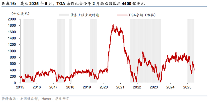 财政部现金余额(TGA)反映政府现金头寸变化,当财政部计划增加TGA余额时,将增加美债供给。美国财政部通常会根据市场流动性情况、债务管理策略设定一个TGA的目标范围,2015-2019年TGA的规模在3000-5000亿,但是疫情后政府债务规模扩张,TGA合意规模有所上升。例如,财政部二季度融资计划将2025年三季度末TGA余额设定为8500亿美元。此外,债务上限也会影响TGA水平。2025年1月债务上限生效导致财政部不能净新增债务,财政部不得不采取非常规措施应对政府日常收支,这导致TGA余额下降。截至2025年5月29日,TGA余额已由2025年2月8422亿美元的高点下降4423亿美元至3998亿美元(图表16)。