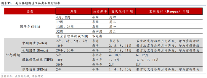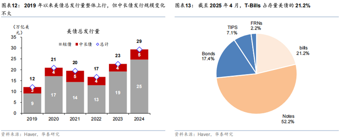 美债可以分为国库券和付息国债两类,有高度可预期的发行节奏。根据久期可以将美债分为两类,一是国库券(或称短期国债,T-Bills),T-Bills期限较短,不直接付息,一般为4周、8周、13周、26周、52周,被视为现金等价物。二是附息国债(Coupons),Coupons包括中期国债(Treasury Notes,2年、3年、5年、7年、10年)、长期国债(Treasury Bonds,20年、30年)、通胀保值债券(TIPS)和付息债券(FRNs),半年或者季度付息,期限都在1年以上(图表11)。T-Bills发行频率高,发行规模大,2024年合计发行规模达到24.7万亿美元,但是由于久期都在1年以下,对国债收益率影响很有限;Coupons发行频率固定,发行规模要小于T-Bills,2024年合计发行规模为4.7万亿美元(图表12)。由于Coupons久期更长,所以发行规模超预期对国债收益率影响较大。例如,2023年8月财政部超预期增加长久期国债的规模一度导致美债收益率明显上行。疫情后,美国财政规模不断膨胀,前财长耶伦为了减少Coupons发行对国债收益率的冲击,在国债发行中更加侧重发行T-Bills,控制Coupons的增加速度。贝森特在就任财长前对耶伦提出批评[3],但其就任财长以后仍然延续了上述做法。截至2025年4月,美债总规模为28.6万亿美元,其中T-Bills为6.1万亿美元,占比为21.2%,较2019年上升6.7个百分点(图表13);Notes和Bonds分别为14.9万亿、5.0万亿,占比为52.2%、17.4%。