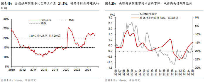 此外,中长期看,联储在国债市场中占比预计将进一步回落,这也将推高美债期限溢价。当前联储仍然持续推进QT,降低其在国债市场中的占比,预计将逐步推高美债期限溢价(图表20)。根据纽约联储一级交易商的调查,预计联储将在2026财年停止缩表。但由于国债市场规模每年增加2万亿美元左右,联储所持有的国债在国债市场存量中的占比未来仍将继续回落,从而持续推高美债期限溢价。