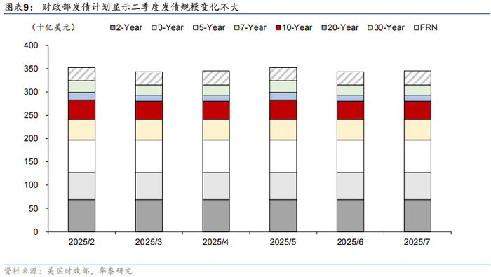 2025财年美债大量到期以及债务上限解除预计不会明显影响美债发行节奏,短期美债供给压力可控。一方面,2025财年美债到期规模虽然达到9.3万亿美元,但主要是对市场影响有限的短债,且与2024财年规模相当。另一方面,债务上限并未影响财政部的发债计划,预计债务上限在6月或7月解除后也不会带来美债供给的明显上升。财政部在最新的指引中也表示,未来几个季度将维持当前的发债计划。因此,短期看美债供给压力相对可控。